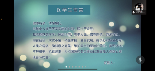 最后,在线的老师和同学一起打开麦克风,在即将踏上实习征程前,跟随者吴瑶老师的领誓,重温医学生誓词。