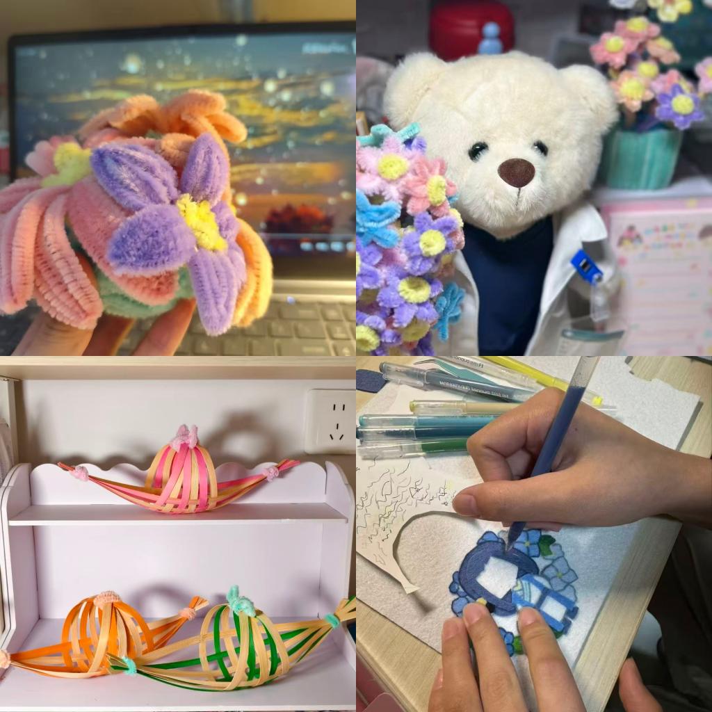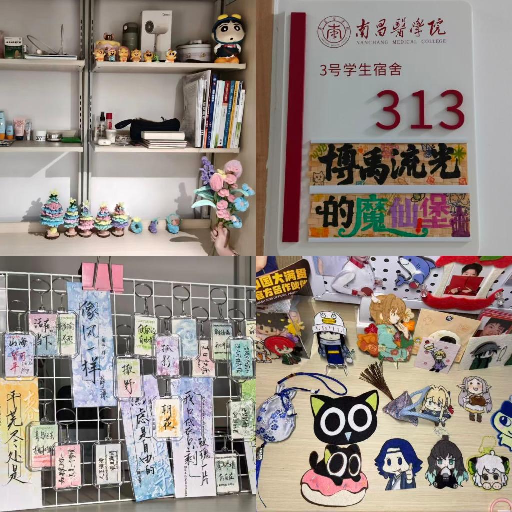 宿舍里的布艺风铃随风轻响,桌面摆着竹编小船和纸花,墙面挂起书法作品,床头的香囊散发着淡淡清香。走进宿舍,传统韵味与生活气息交融,每一处布置都透着学子的巧思,让宿舍更显温馨个性。