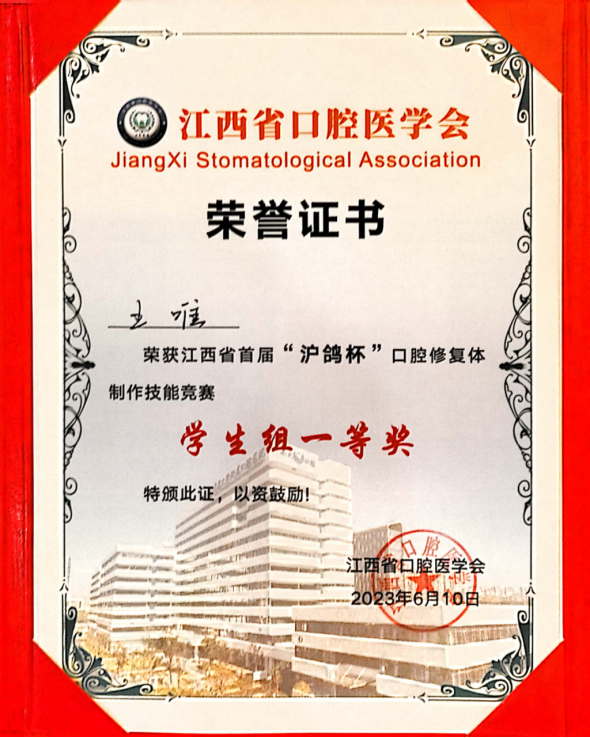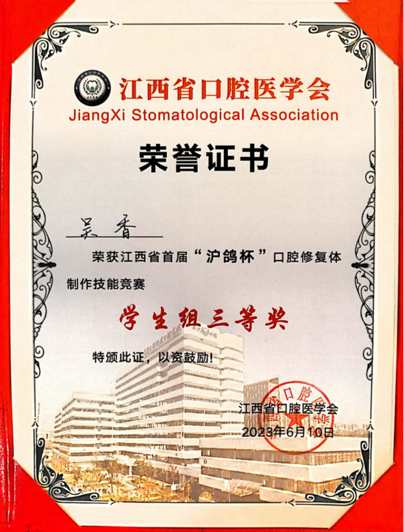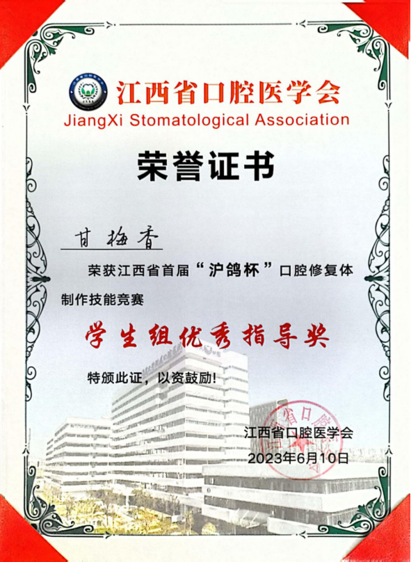 2023年6 月 10 号下午,江西省口腔医学会和江西省口腔修复工艺学专业委员会举办的江西省口腔修复工艺学专委会首届“沪鸽杯”口腔修复体制作技能竞赛昌举行大赛吸引了全省开设口腔医学技术(口腔修复工艺技术)专业的中高职、本科院校的师生参加。我院甘梅香老师带队参赛经过激烈角逐,beat365官网在此次比赛中共斩获学生组一等奖一项、三等奖两项、优秀奖一项和优秀指导老师荣誉一项。